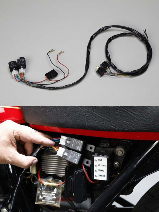 在某些情況下,插頭不是H4型或者因為物理空間的限制,只能沿用目前插頭。如今,有許多改裝的電氣零件能解決此類問題,如果你想讓大燈更亮,那”大燈繼電器套件 “就是為你準備的!大燈繼電器套件可以實現簡單的線束管理,而繼電器單元並非放在大燈箱內或油箱下,而是放在電池附近或側蓋內。