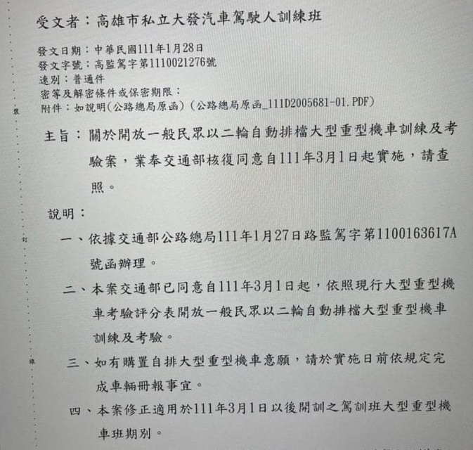 日前高雄的駕訓班收到交通部公路總局函件,該函表示交通部同意自民國 111 年 3 月 1 日起,將開放民眾以「二輪自動排檔大型重機」進行場內訓練與考照,而 3 月 1 日駕訓班也將推出對應免打檔車種的班別。
