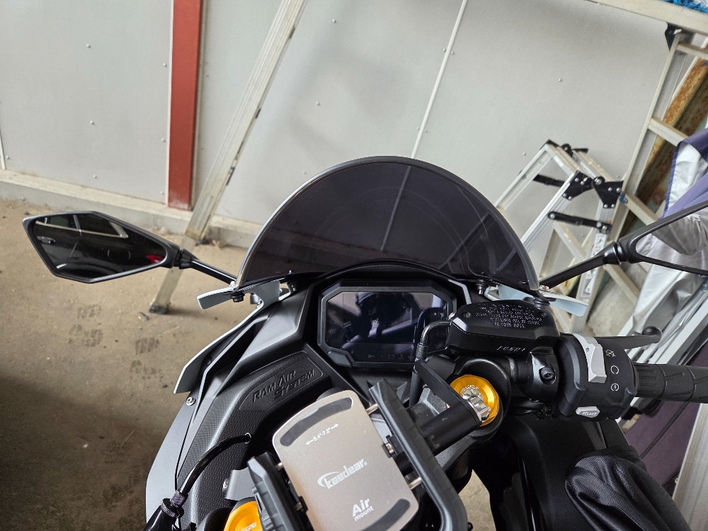 「ZX25R與4RR可以共用,自行安裝有點難塞,需要一些技巧。整體防風性能比原廠好很多,原廠風切大約在胸口附近,加裝這個可以提升到安全帽面部,配合X-15的造型,有大幅減少風切噪音與阻力的效果,原廠時速110就很痛苦,加裝完過160以上都很穩定。高度並非市面上最高的,但個人認為再高下去很破壞整體造型(很像頂一個超高飛機頭),算是外型與功能相互妥協平衡的產品。」