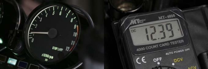 当时有用于将交流电转换为直流电的整流器和控制电压的调节器的Kawasaki原厂零件。检查充电电压是否上升是最基本的事情,但即使电压上升,充电条件也不会改善,除非你用适合情况的 “电流 “充电。有时由于线路老化等原因,即使电压上升,电流值也不会上升,所以也必须测量电流值。有了旧车诞生时没有的DCA(直流安培)钳形测试仪,诊断就很容易了。