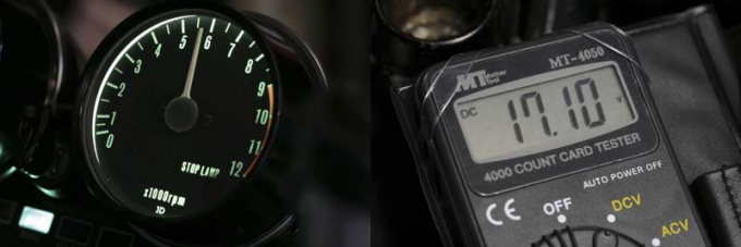 ▲当引擎转速增加时,电压上升到17.10V!跟怠速相比上升了约4.7V。换句话说,充电电压会随着引擎转速而升高,但是…这个变化数值明显过度充电!