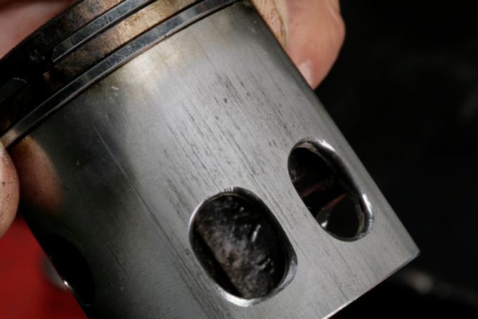 在上世纪70年代的老式二行程引擎上,活塞两侧或多或少都有磨损痕迹,这并不奇怪,因为铸铁气缸和铝制活塞的热膨胀率不同,所以在使用时很容易刮伤,如果是在引擎尚未暖车完成的情况下大补油门的话,那么活塞就更容易刮伤。