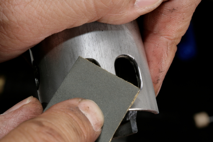 ▲用砂纸修补刮痕时,要将砂纸与刮痕保持一定角度将刮痕抹平,并不需要把所有的划痕都刮掉,只要把凹凸不平的地方和缝隙变得不明显就好,这里用的是600号砂纸,因为它不会刮得太深。