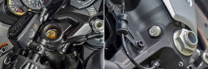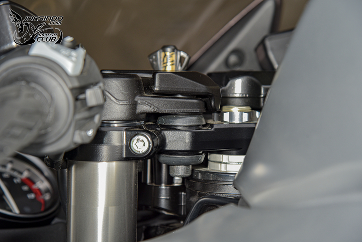 本次 HAYABUSA 在把手设计上别具新意,锁固方式是以把手冠座盖将分离把与上三角台锁定在一起,而每个零件间都使用了具备减震功能的橡胶套筒来固定,如此一来就能大幅度降低把手端的震动感,但用力推、拉把手时可以感受把手有轻微位移,此为正常现象,准车主们可以放心。