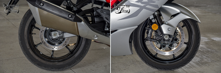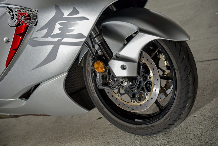 新款 HAYABUSA 采用新设计的七爪轻量化轮框,配胎为 BRIDGESTONE BATTLAX HYPERSPORT S22,前轮尺寸为 120/70ZR17 M/C (58W),后轮尺寸为 190/50ZR17 M/C (73W),行车路感虽然舒适,但弯道性能一样相当有水准。