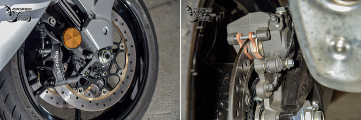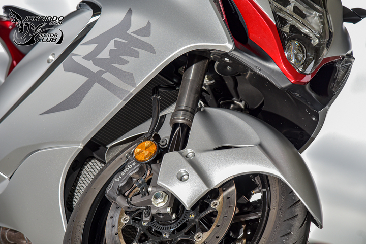 接着来到制动系统的部分,HAYABUSA 采用一对 Brembo Stylema 辐射卡钳搭配一组 320mm 的浮动碟盘,后制动则是 NISSIN 单向单活塞卡钳,且前后皆搭载了 ABS 系统、弯道 ABS 系统,而后制动系统还有斜坡起步辅助系统,当骑士在斜坡上起步时,系统会自动锁定后煞车,让骑士可以专心控制离合器和油门。