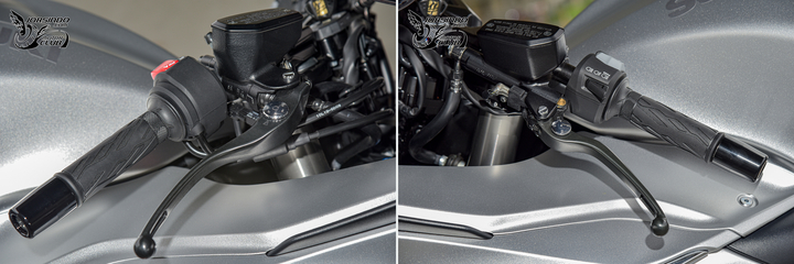 HAYABUSA 采用油压离合器,所以在左侧拉杆采用了油压总泵,且左右拉杆皆具备拉杆间距可调,左手拉杆有四段可调,右手拉杆则有十段可调,但间距最近的段数仍离把手有一点距离,建议手掌较小的骑士可以亲自操作看看。