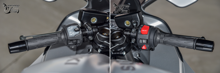 画面转到把手开关,在左把手部分设有远近灯开关、选单功能键、模式选择键、方向灯开关及喇叭钮等,右把手开关则设有复合启动钮的引擎熄火开关、定速功能开关、警示灯号等,操作上清楚明了。