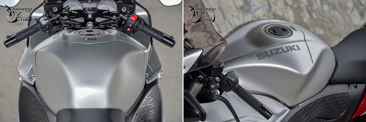 在第三代 HAYABUSA 上,SUZUKI 工程师将骑士与把手间的距离缩短了 12mm,油箱设计也相当容易夹持,而从侧前方向看去,可以感受到 HAYABUSA 的油箱造型与 SUZUKI 当家跑车 GSX-R1000 确有几分相似。
