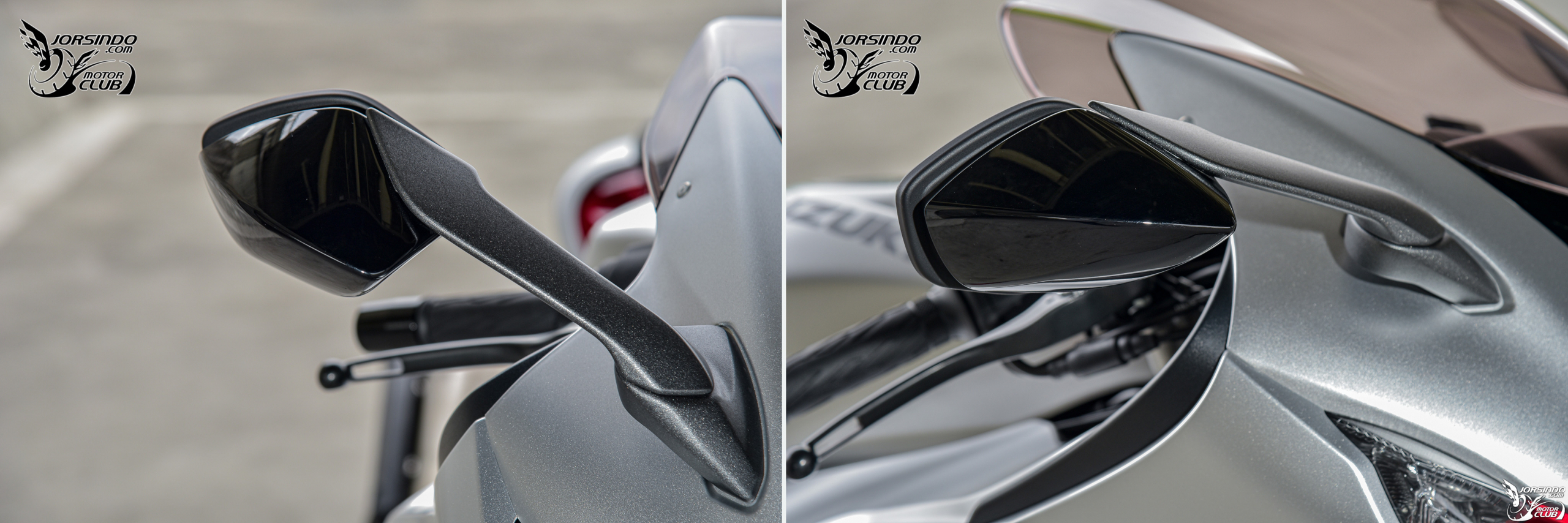 后照镜同样针对空力进行设计,后照镜的镜杆造型较扁且锐利,在镜杆前端设有转轴,骑士可以把后照镜往前推到底收折起来。
