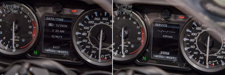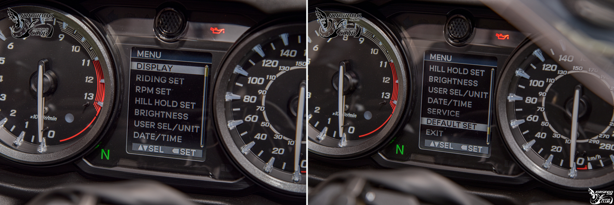 长按“下”键之后会跳出仪表选单,如下列组图所示,且在主选单中有“仪表显示”、“骑乘设定”、“超转灯设定”、“斜坡起步辅助系统设定”、“仪表亮度”、“仪表显示设定”、“日期及时间设定”、“保养提醒设定”、“回复默认”、“离开”等,骑士可以根据个人偏好来进行设定。