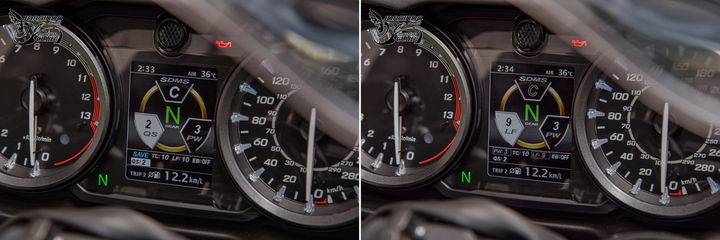 在“ACTIVE DATA”显示模式中,上方一样会显示当下骑乘模式,而各辅助系统的段数则会在仪表下方一并表示,中央两侧多出倾角计以及油门开度、前后煞车行程量等资讯。