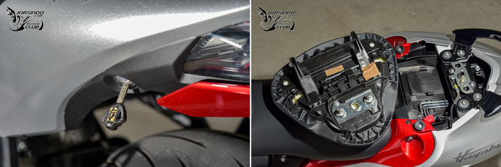 后座盖的开关在车尾左侧下方,需使用钥匙开启,坐垫下方附有随车工具。