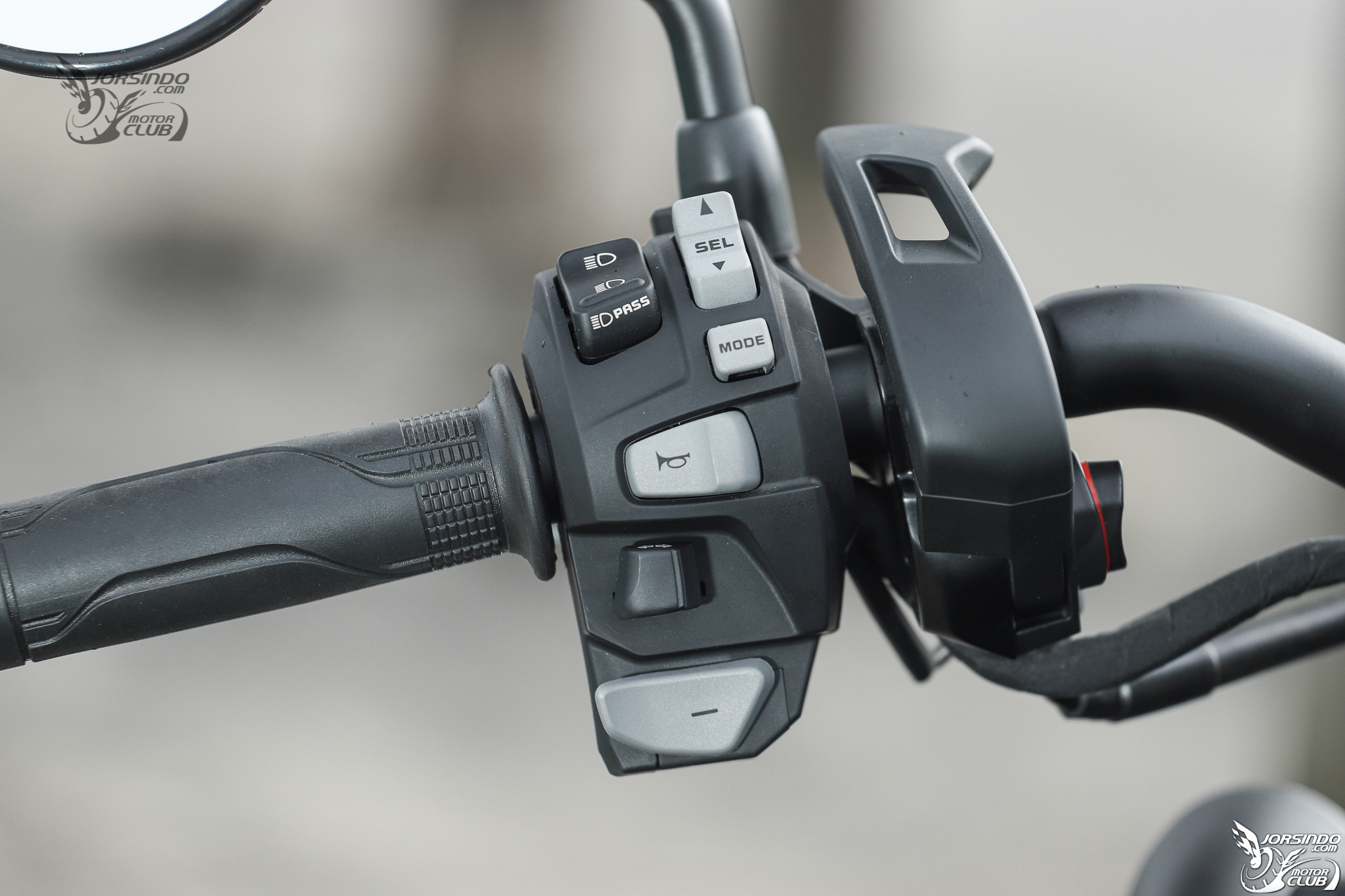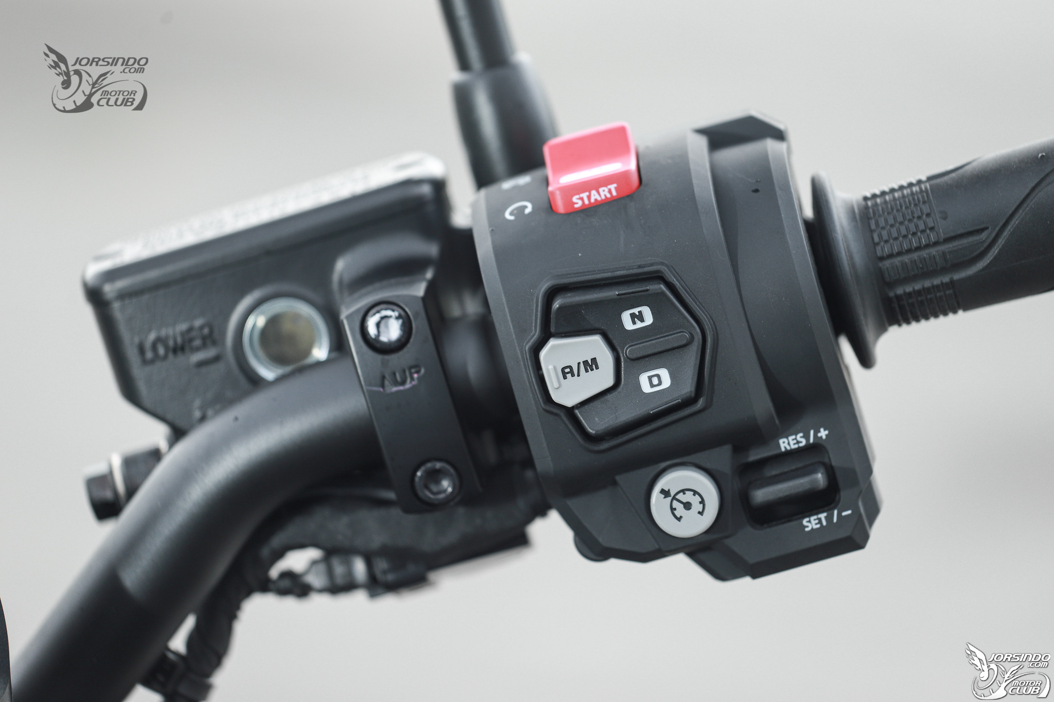 左侧开关为远近灯、仪表与骑乘模式选择、喇叭、方向灯以及手动升降档功能。由于 DCT 系统的缘故,停车时必须要用手煞车辅助,因此能在左侧把手处看到手煞车开关,但造型就…与车型有些不搭!