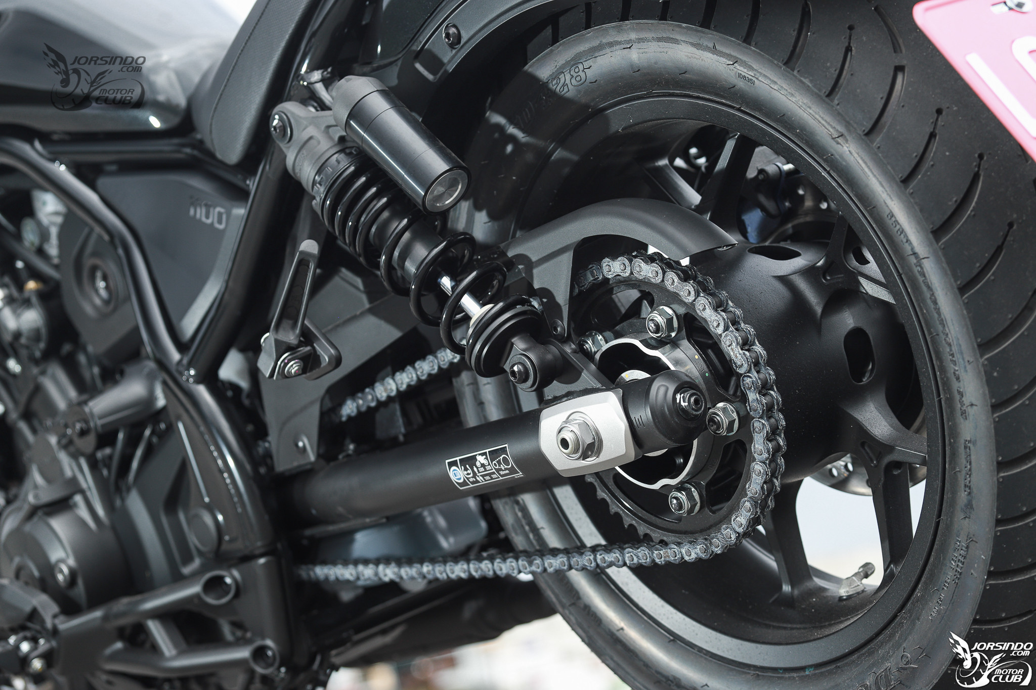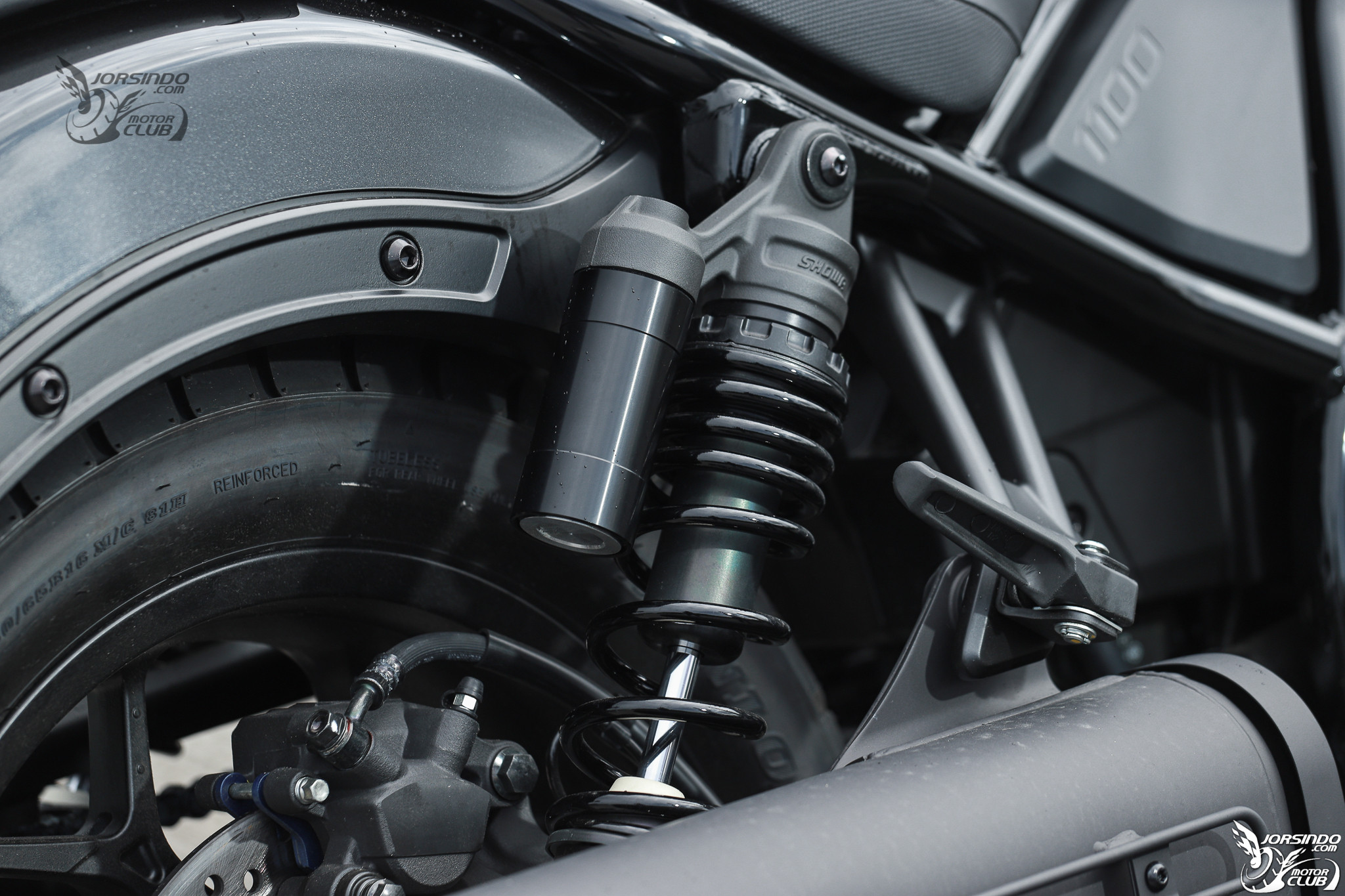 后悬吊则是 SHOWA 特别为 Rebel 1100 打造的挂瓶避震器,具有 19 段弹簧预载可调。