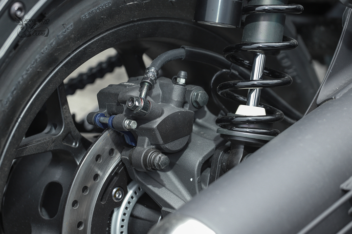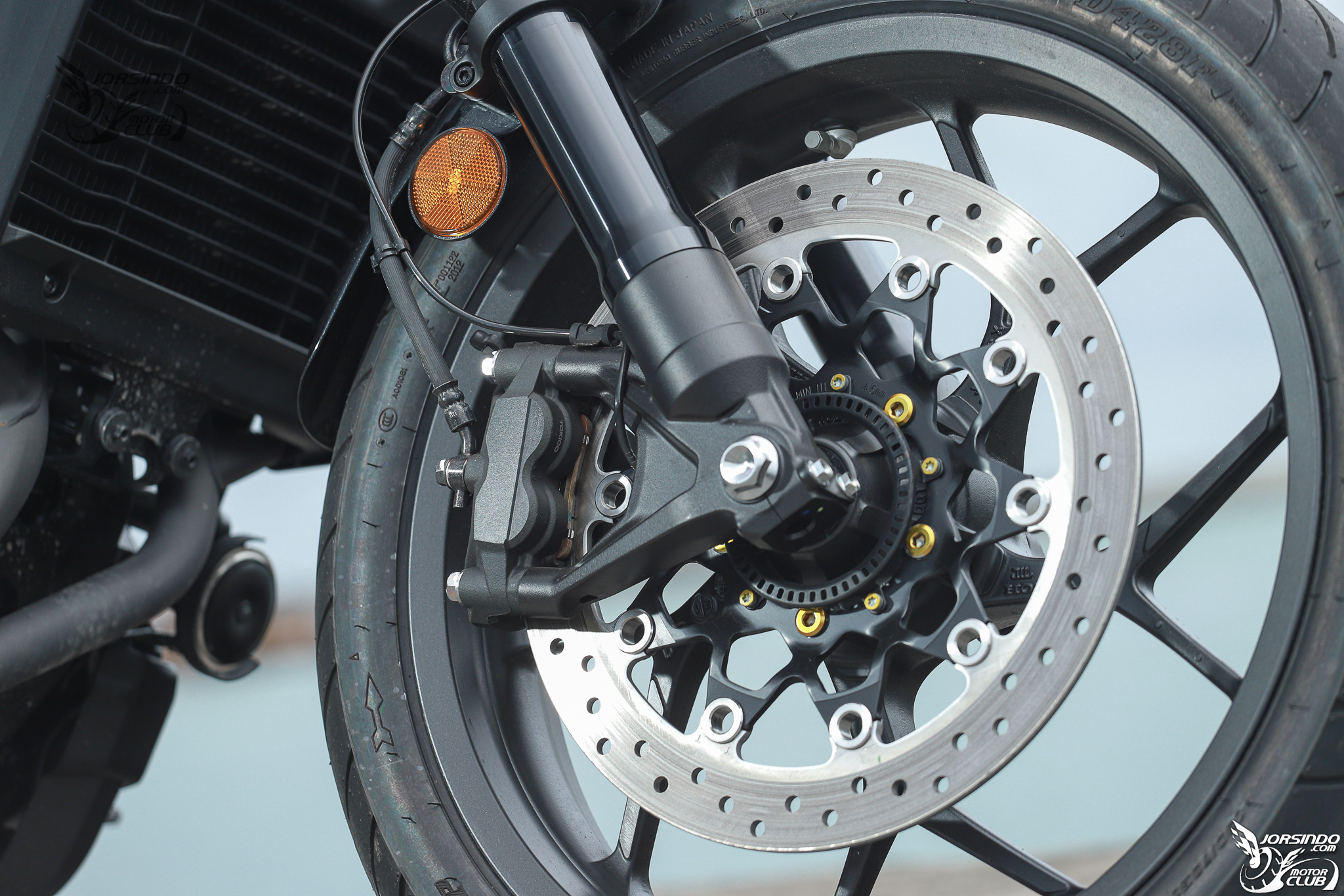 前制动系统为单 330mm 浮动碟盘搭配辐射对四活塞卡钳,以美式机车来说制动力道出色。