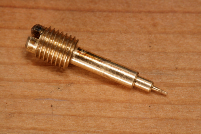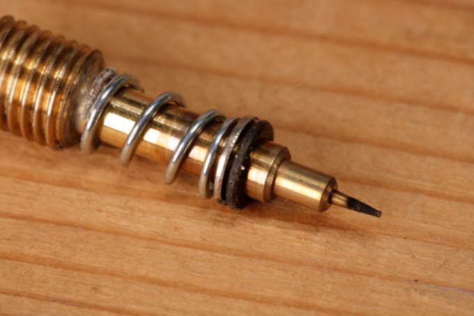 如果拆下的螺絲尖端有積碳,可以用化油器清洗劑或零件清洗劑清洗,這對清除積碳很有效。細針尖是測量混合氣的部位,要避免用無紡布或鋼棉擦洗。