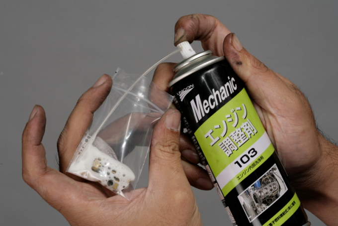 ▲化油器清洗劑或燃燒室清洗劑可以清洗掉一些頑固汙垢,但如果發現汙垢的清除效果不好,可以將噴有清潔劑的塑料袋加熱,以活化化學物質的提高汙垢清除效果。
