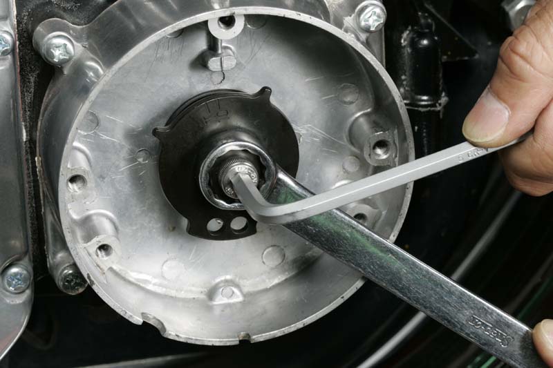 ▲拆下左側蓋內的傳動鏈條加油箱,然後安裝點火裝置。