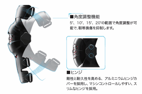 採用碳纖維骨架與不對稱型絞鍊的高級款式,藉由內側絞鍊比外側纖細40%的設計,減少膝蓋彎曲時的不適感,同時角度可以在5°、10°、15°及20°的範圍內調整,有效抑制韌帶損傷。