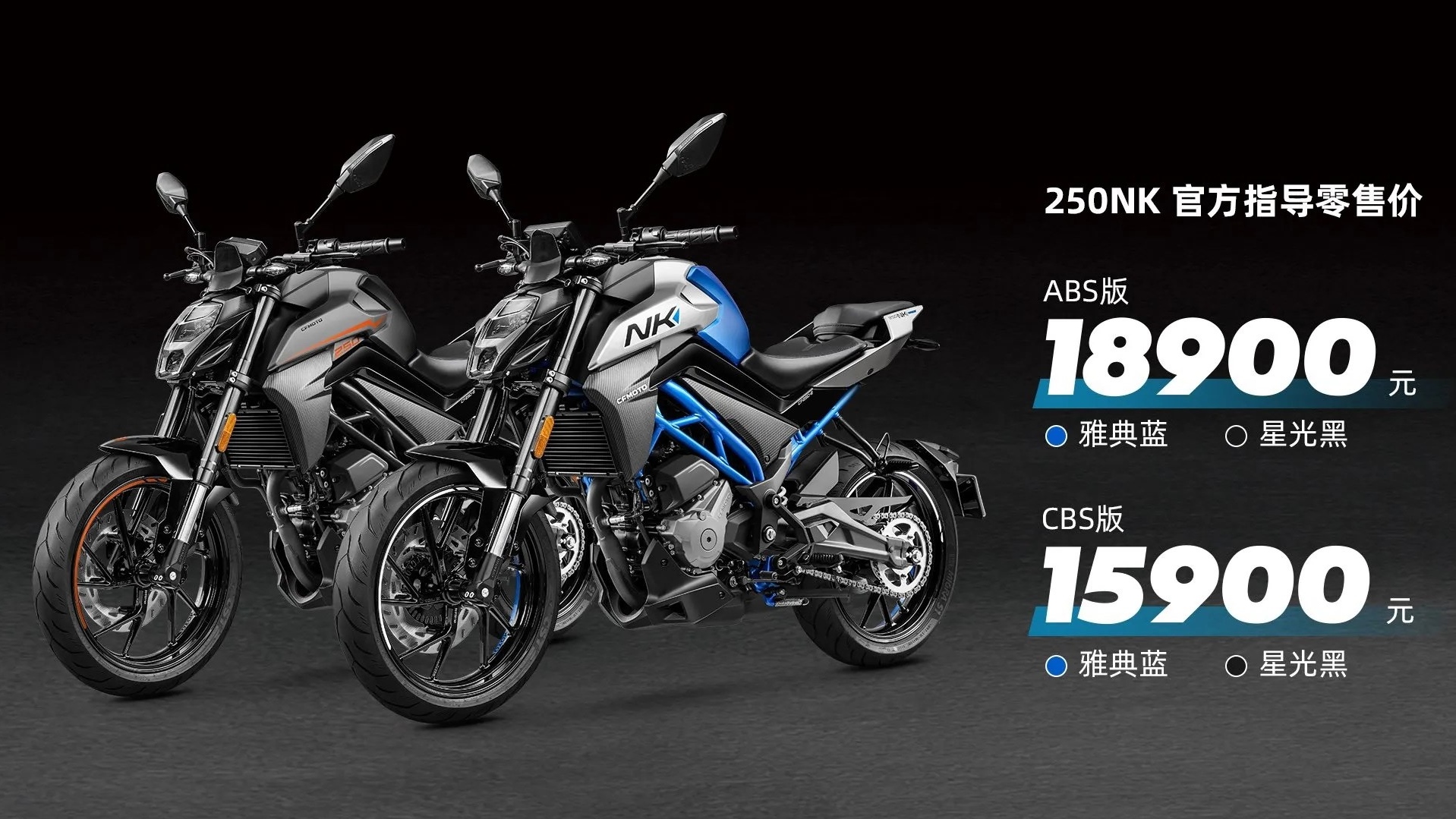 2022年式250NK共推出雅典藍及星光黑等兩款車身配色,同時還有配備ABS或CBS等不同煞車系統供消費者選擇,ABS版本採用全數位TFT LCE儀表、CBS版本則是單色LCD儀表,且ABS版本的變速箱還加碼採用CF-SC 滑動離合器。