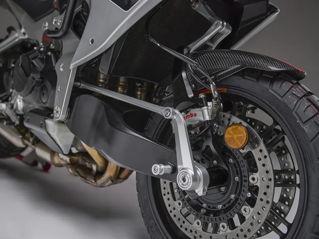 前輪同樣採用搖臂結構,轉向系統透過安裝在煞車卡鉗上方的連桿部件與手把連接。