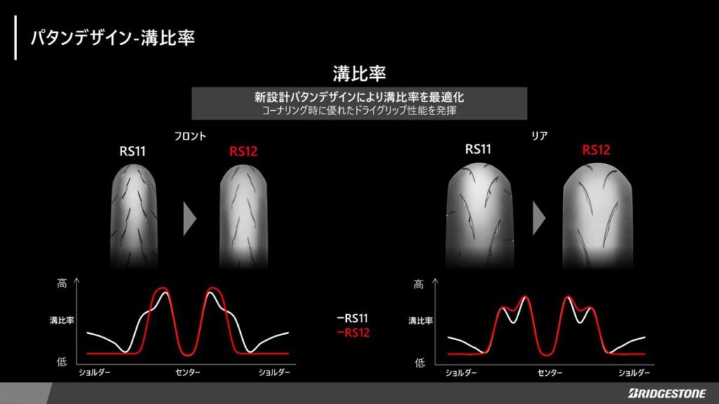 BATTLAX RACING STREET RS12以在二輪耐力賽事中屢獲勝利的技術為基礎,全面提升了乾地抓地力與賽道騎乘表現,單圈成績較前代RS11明顯縮短。在BATTLAX 系列中,展現出乾地抓地性能最卓越的市售輪胎。