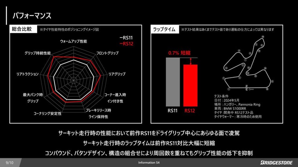 透過上述多項性能強化後,RS12 在賽道騎乘性能表現全面超越RS11,不僅單圈時間更快,即便行駛圈數增加,也能有維持穩定抓地力。