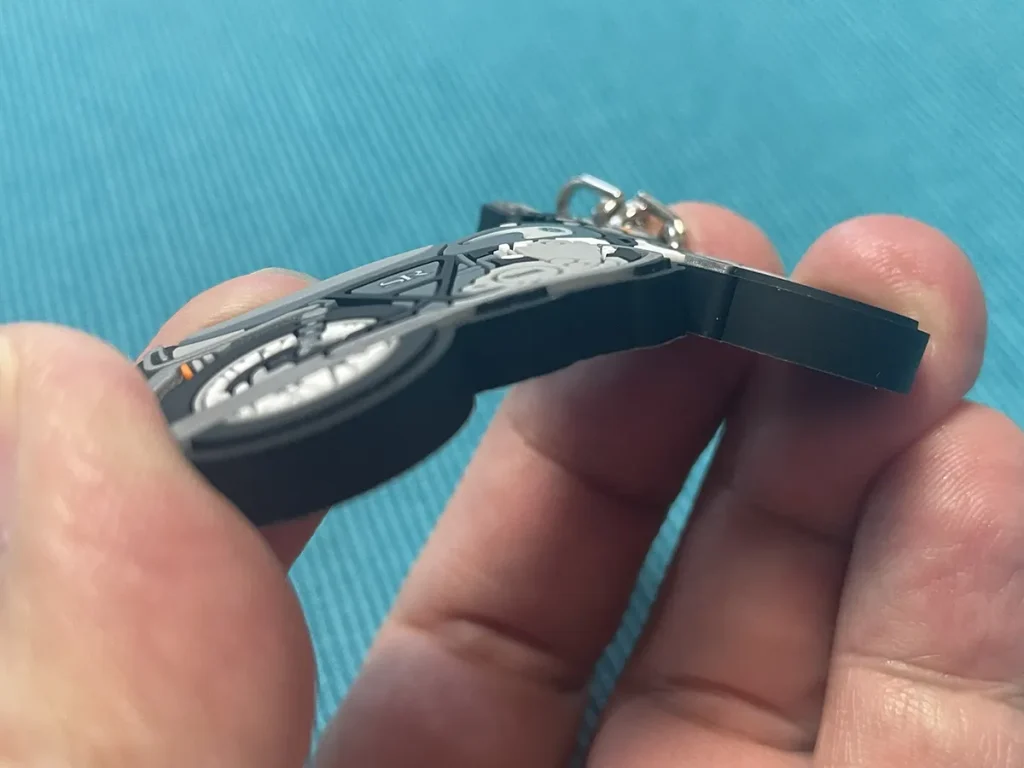 鑰匙圈本體為橡膠材質,即使掛在機車鑰匙上也不易刮傷車體。鑰匙環並非一般雙環款式,而是採用容易拆裝的鉤環設計。鏈條長度較短且配有旋轉環,使用非常方便。實際裝上機車鑰匙測試後,發現某些車款可能出現鏈條部分碰觸車體零件的狀況,此時可考慮改用皮繩等替代方案。